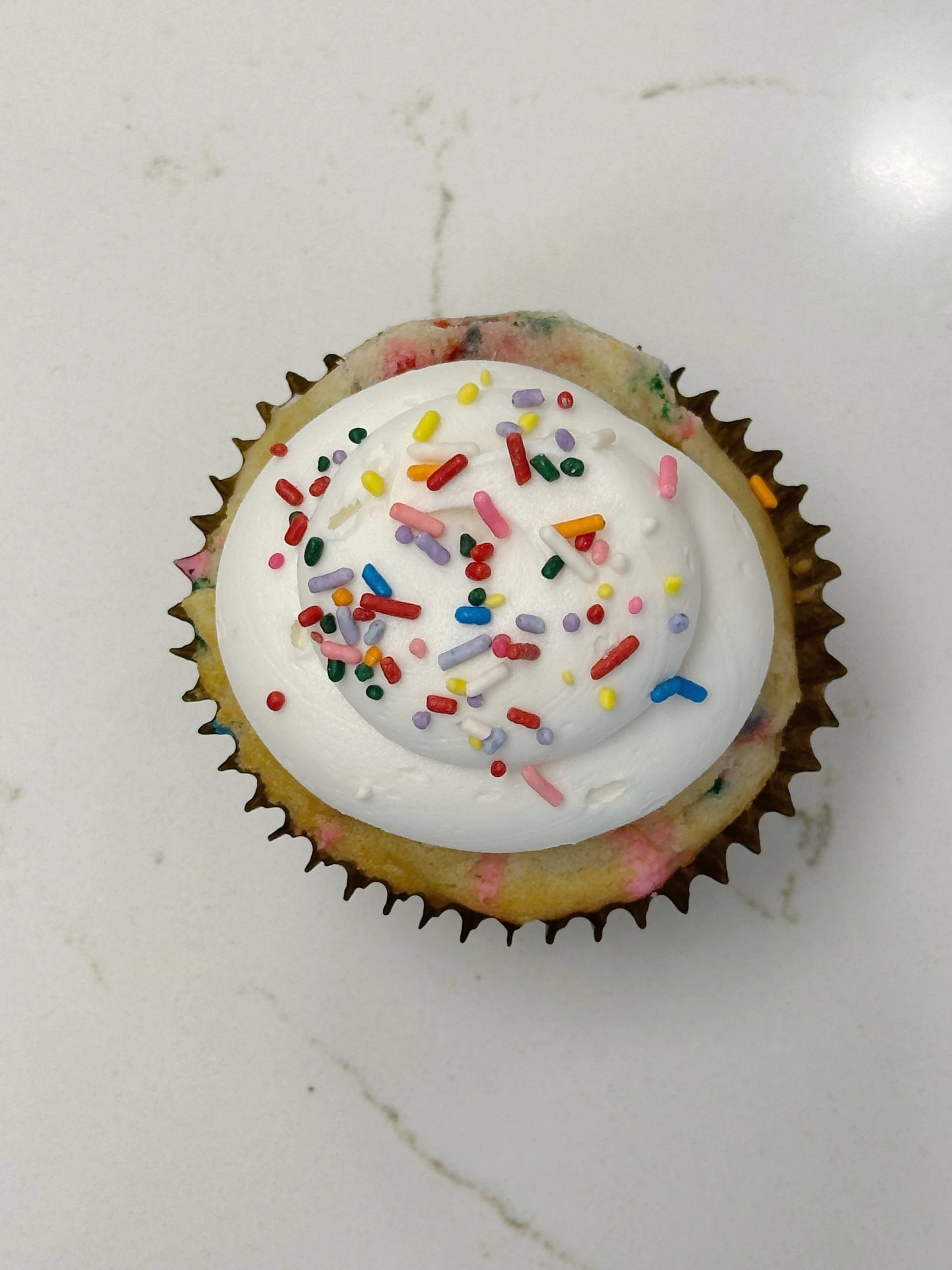 vanilla funfetti cake with vanilla buttercream with rainbow jimmy sprinkles
