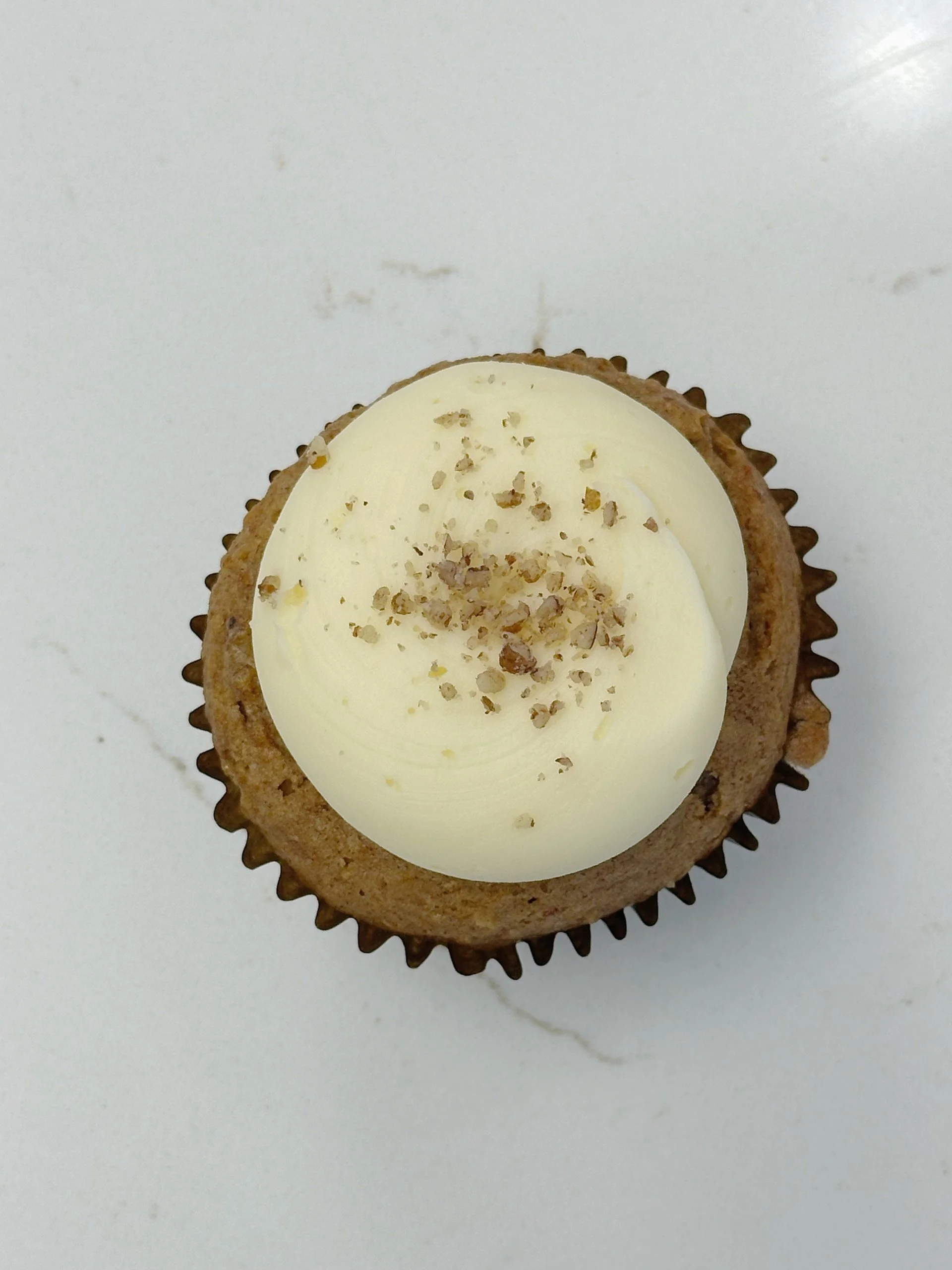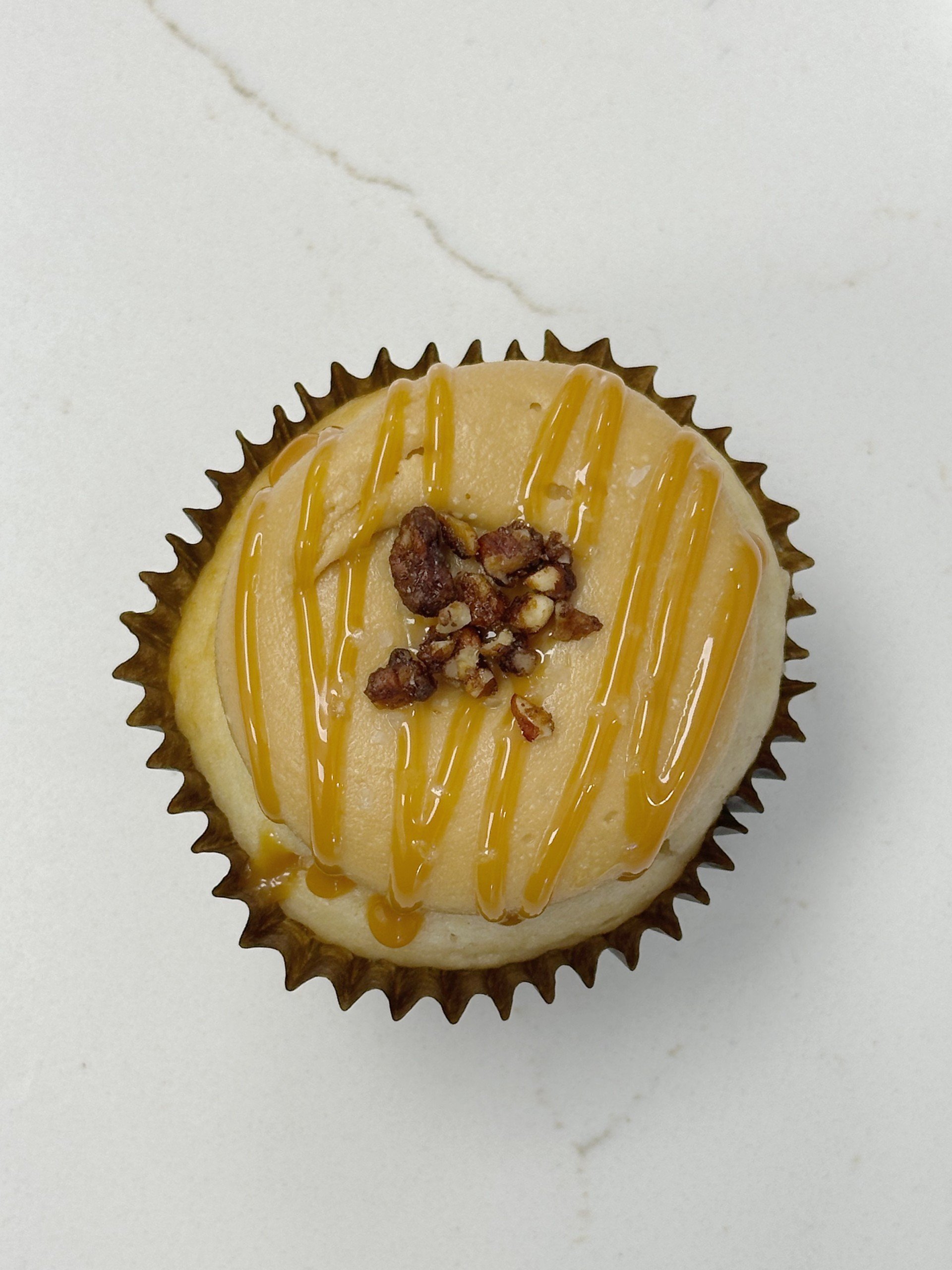 vanilla cake with caramel icing, caramel drizzle, a pinch of sea salt & candied pecans
