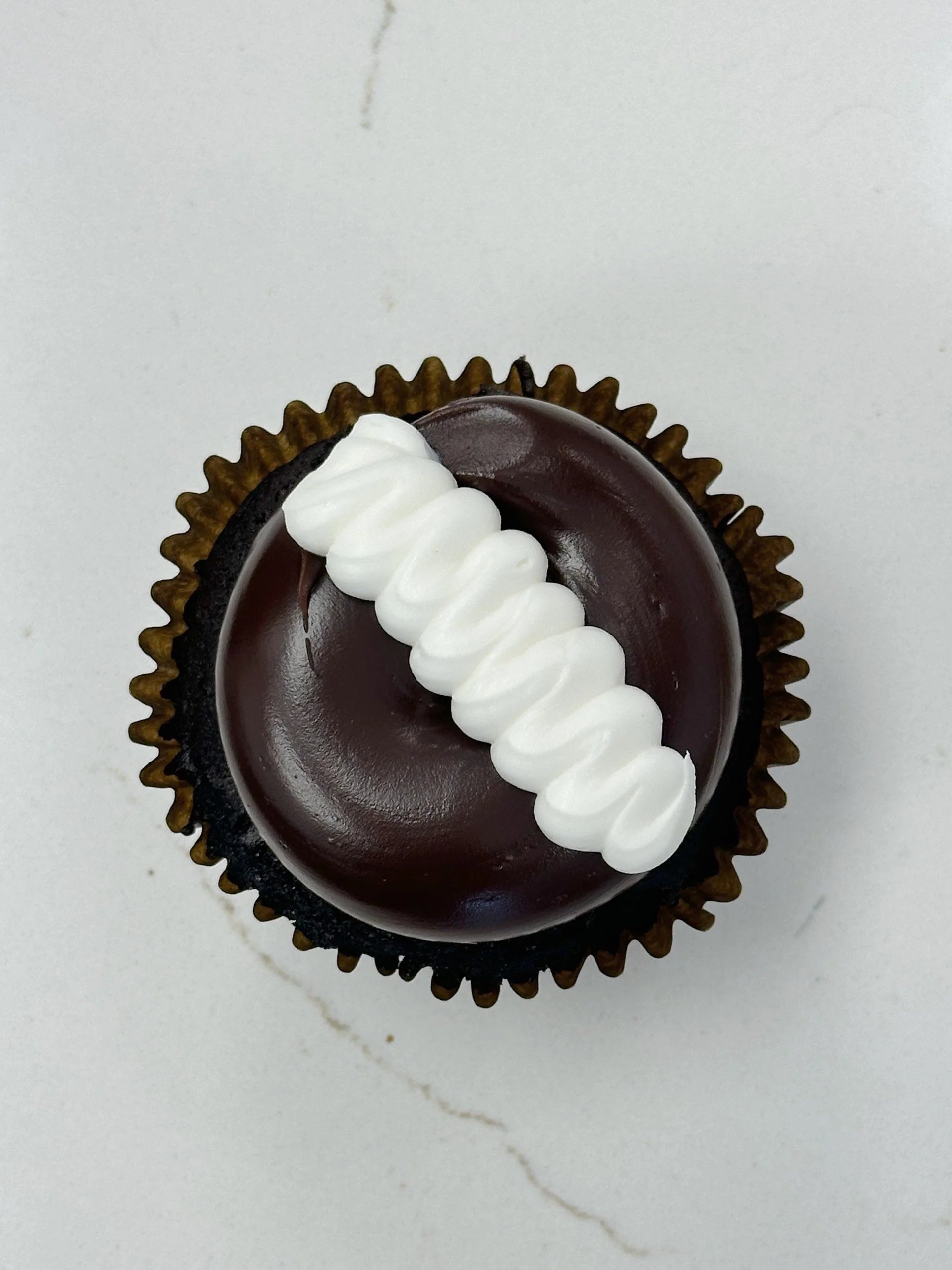 chocolate cake filled with vanilla buttercream with fudge icing & a squiggle of vanilla buttercream