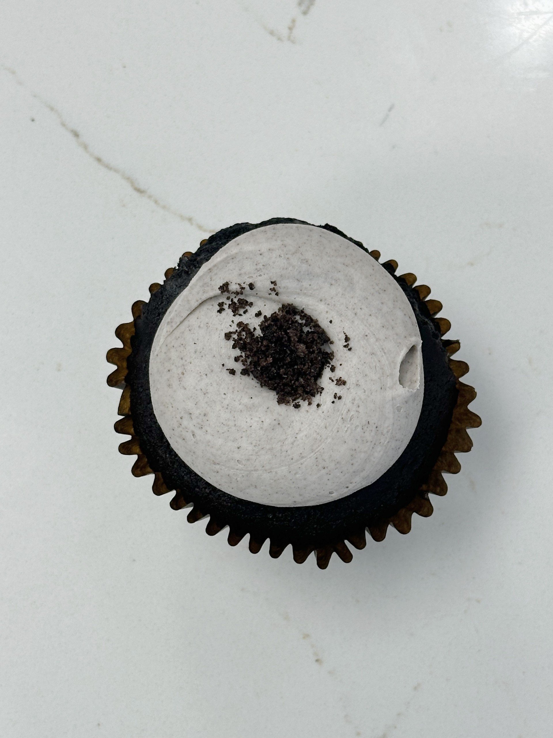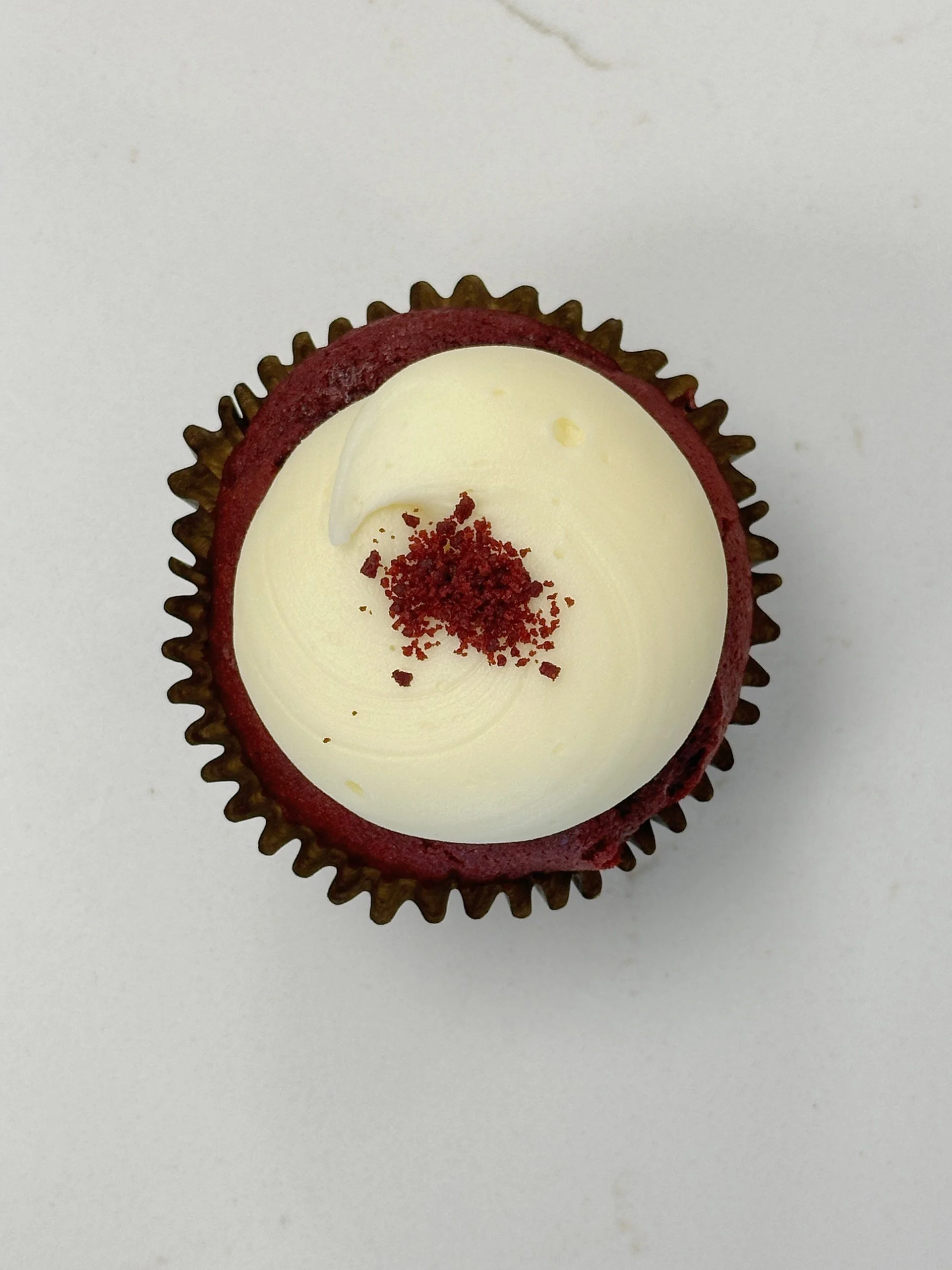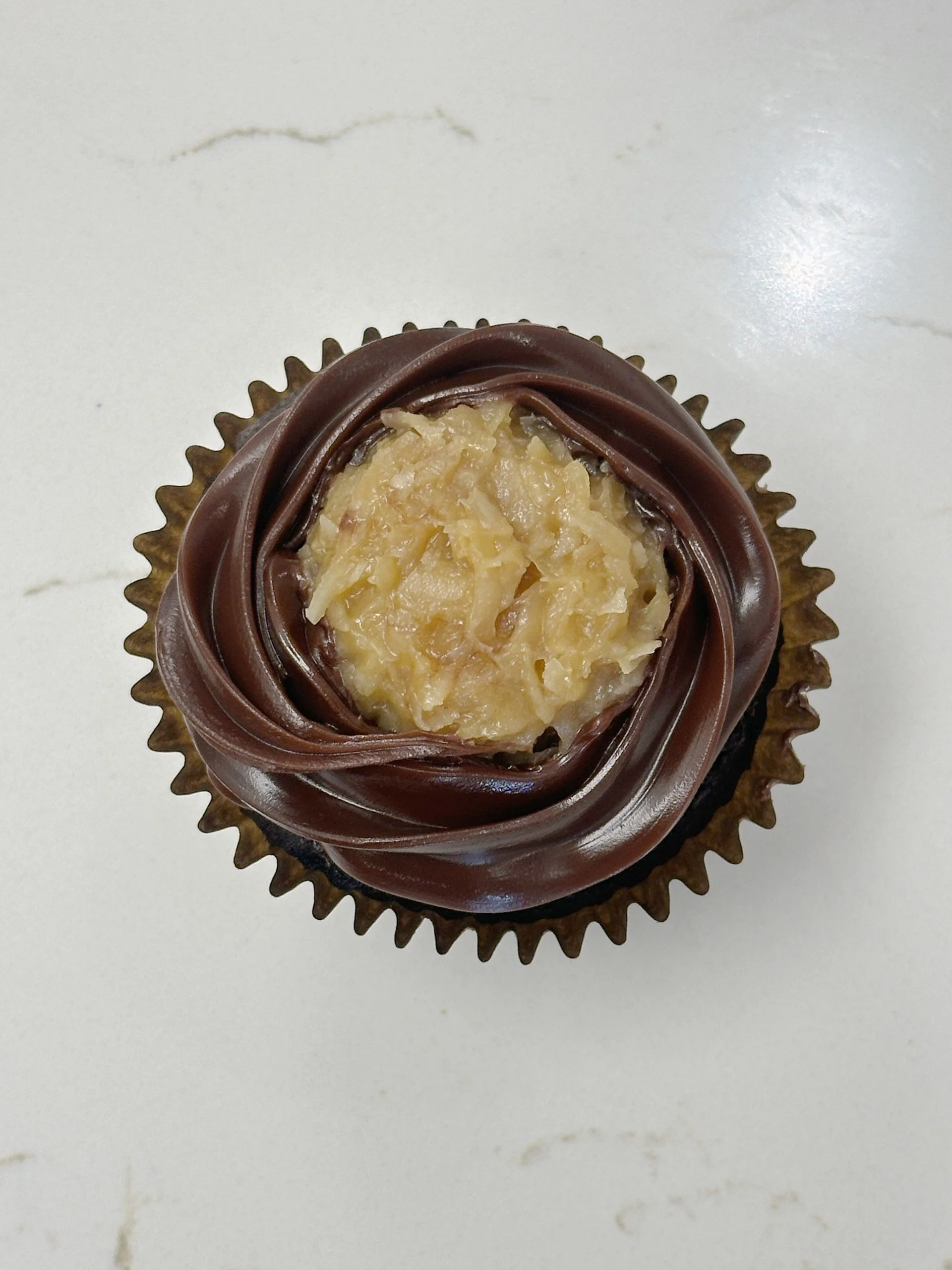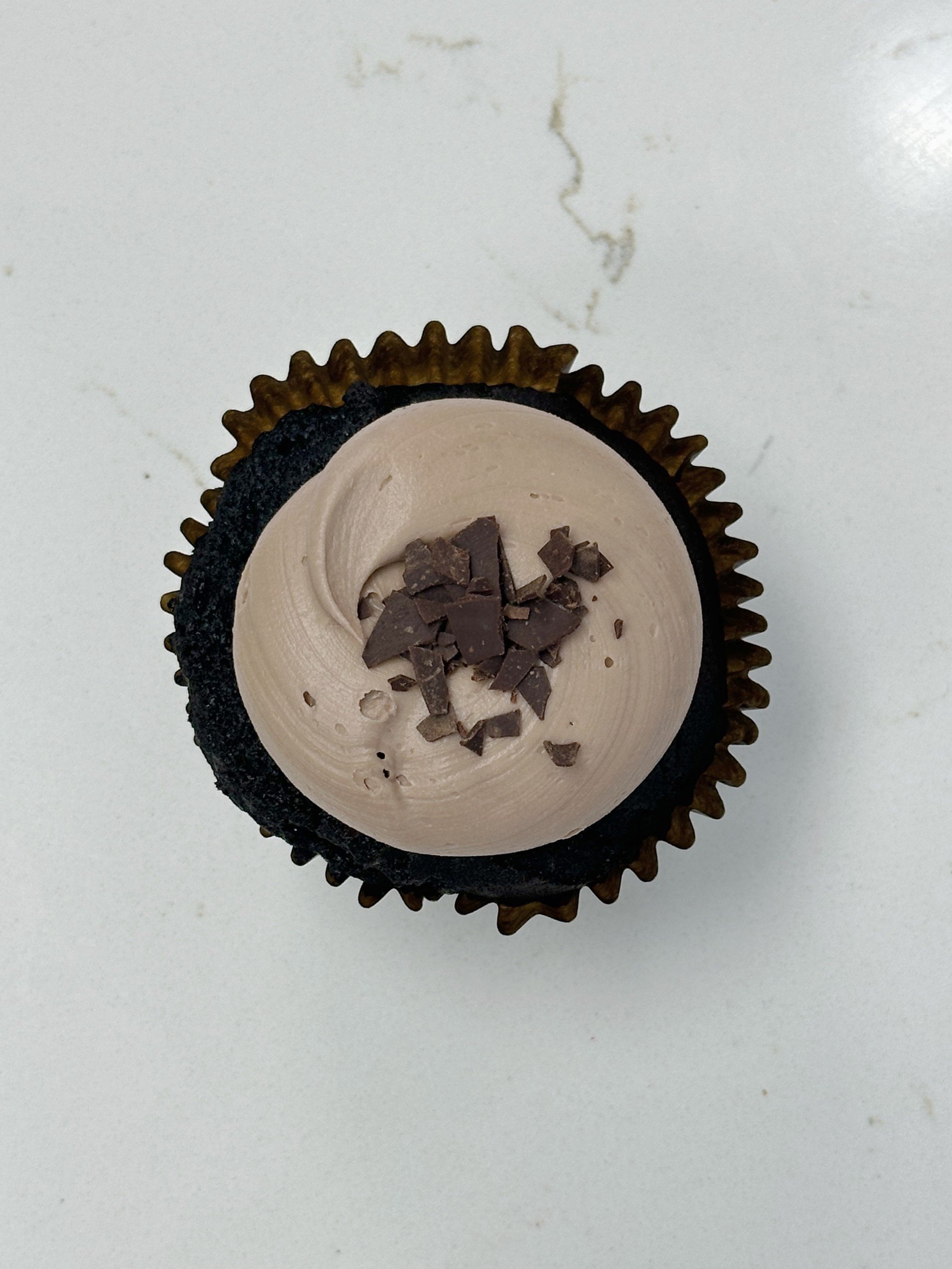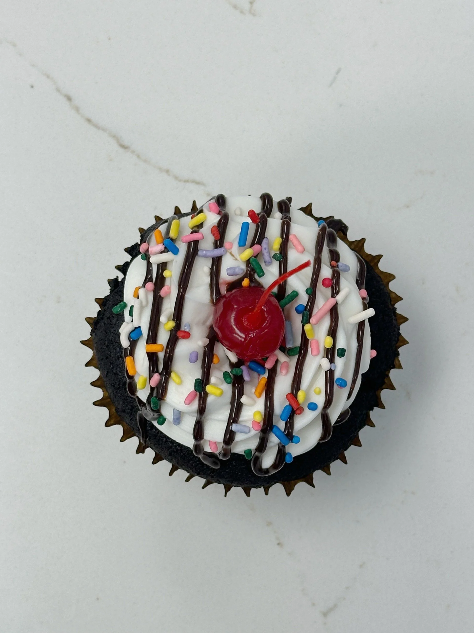 chocolate cake filled with fudge, with vanilla buttercream, fudge drizzle, rainbow jimmies & a maraschino cherry