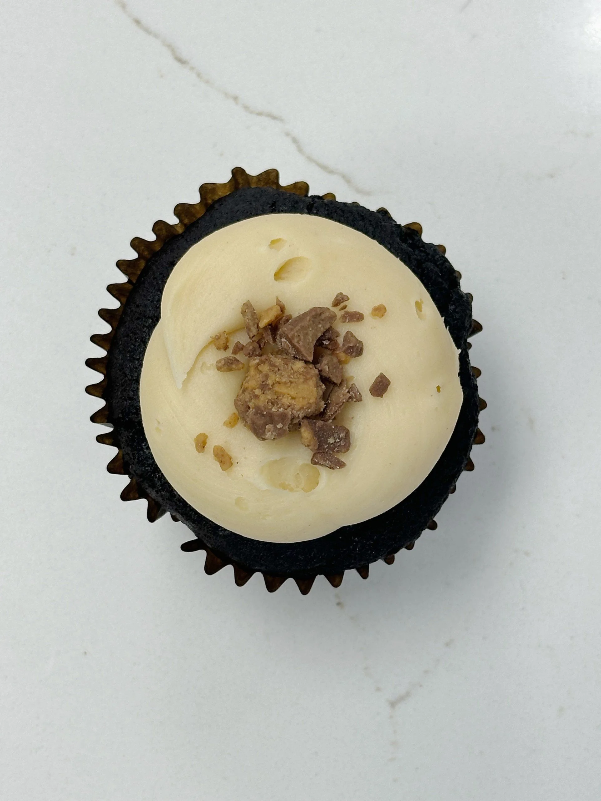 chocolate cake with peanut butter cream cheese icing & crushed reese’s