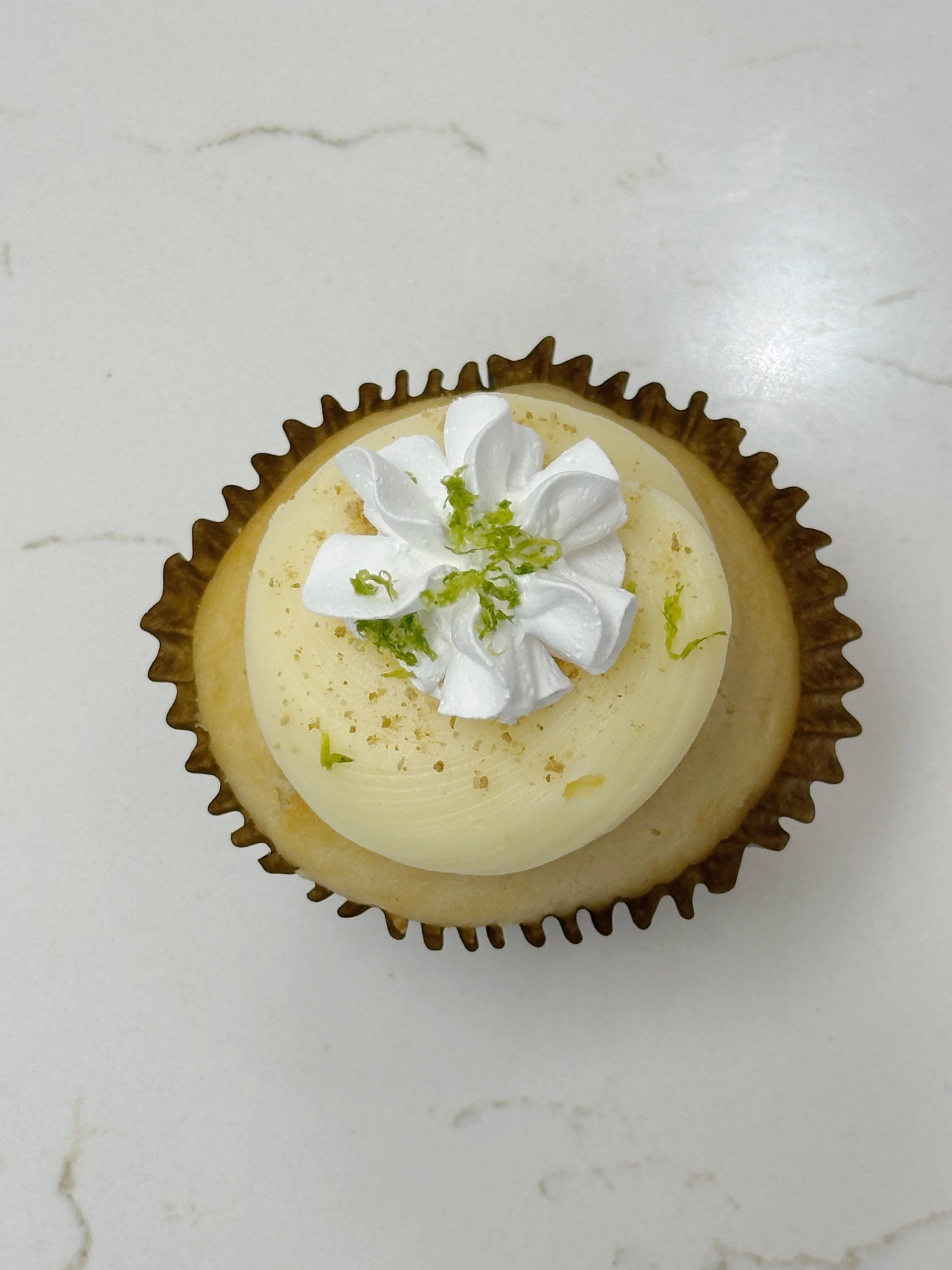 vanilla cake filled with lime cream cheese icing, topped with lime cream cheese icing, graham cracker crumbs, whipped icing swirl & lime zest